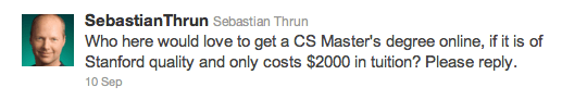 The tweet pictured above was posted earlier this year by Stanford professor and Google engineer Sebastian Thrun. When not busy heading up development of Google’s self-driving car, Thrun has spent the past few months doing something equally intriguing. Thrun, along with several of his colleagues at Stanford, has been part of an experimental  program in e-learning that could one day bring Stanford quality education to the masses, and may even give your $200,000 degree a run for its money.