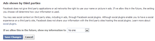 The fact that Facebook feels the need to ask me for this setting tells me that very soon, they plan on letting advertisers use my name and pictures in their ads, presumably to convince my friends that since I like something, they should buy it too. It only took me four clicks to find this page and prevent advertisers from plastering my friends’ Facebooks with pictures of me endorsing some product.