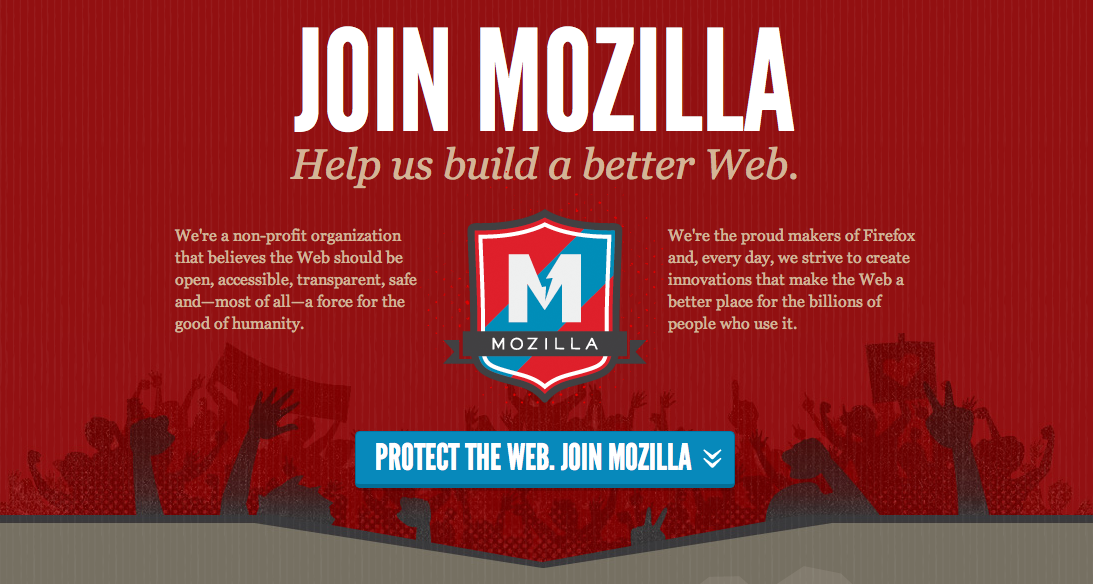 The imagery and the the advertising behind Mozilla looks revolutionary in ways that Richard Stallman would love (although he’d rather call it a free internet). The dark red of the background and the extended fists in the the foreground instantly register as a political protest. It’s as if Mozilla is the voice of the populous. With the statement describing the way the Web should be and discussing its impact on humanity highlight the company’s justifiable self-importance. They sincerely believe in this right and encourage people join in not necessarily to develop technologies, but to contribute to a movement.
